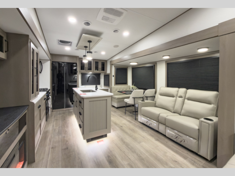 Sleeps 7 Slides 4 Length 39 ft 11 in Ext Width 8 ft Ext Height 12 ft 8 in Hitch Weight 2400 lbs GVWR 14995 lbs Dry Weight 12500 lbs Fresh Water Capacity 74 gals Grey Water Capacity 79 gals Black Water Capacity 79 gals Tire Size ST235/85R16LRE Furnace BTU 35000 btu Number Of Bunks 1 Available Beds Queen Refrigerator Type 12V Refrigerator Size 16 cu ft Cooktop Burners 3 Number of Awnings 2 LP Tank Capacity 30 lbs Water Heater Type On Demand Tankless AC BTU 15000 btu TV Info LR 40" TV Awning Info 13' & 10'6" One-Touch Electric LED Axle Count 2 Number of LP Tanks 2 Shower Type Radius Electrical Service 50 amp Solar Wattage 370 watts Similar Floorplans