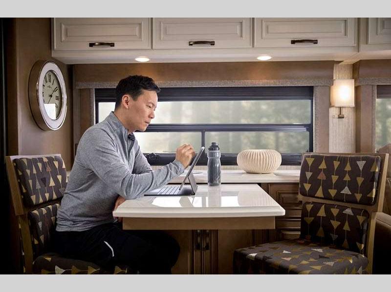 The exterior full-paint Masterpiece Finish is an industry exclusive, and it will attract every eye on the road. These luxurious coaches are absolutely filled to the brim with enticing amenities, like the convection microwave, Samsung LED TV, Bose sound bar sound system, and Xite dash radio with 9" monitors. There is also a Nav-N-Go navigation system, Villa Comfort Fit furniture, plush pillowtop mattress, and wireless phone charging mat.